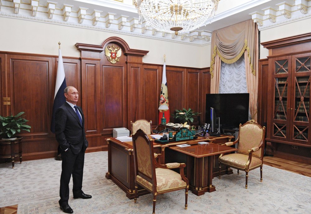 Справа и слева от стола – флаг Российской Федерации и штандарт Президента. Ближе к окну – стол для переговоров, удобное место для деловых встреч и совещаний с помощниками.
