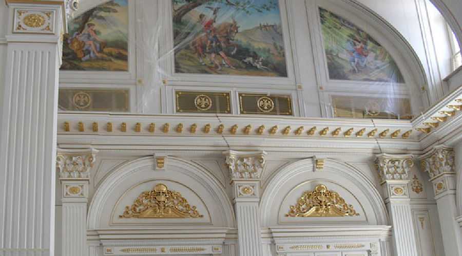 - Зал аудиенции выполнен в светлых тонах с позолотой, украшен портретами российских императоров.