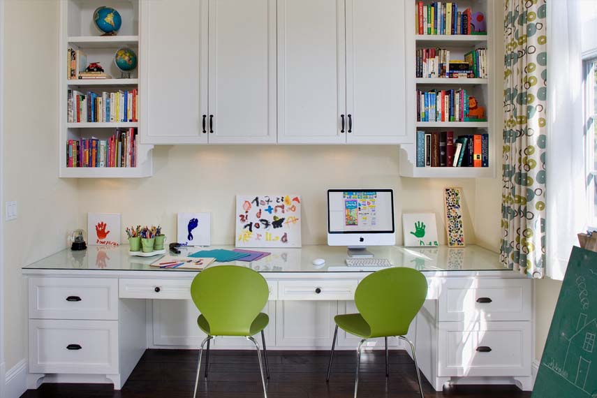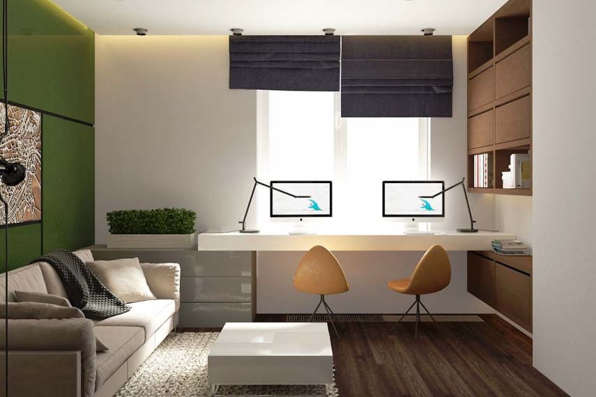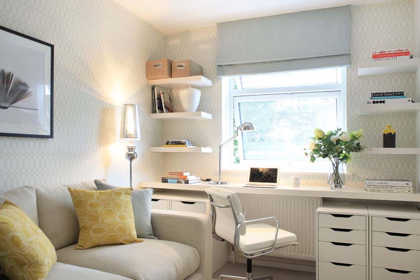 В пространстве между противоположными стенами можно соорудить длинный стол, так получится организовать объемную систему хранения над и под столешницей. Преимущество такого решения в том, что комната не выглядит загроможденной, даже если полки занимают всю стену до потолка.