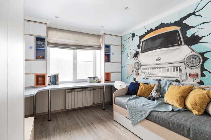 Благодаря коротким шторам, у окна можно установить письменный стол школьника, чтобы в рабочей зоне всегда было хорошее освещение.