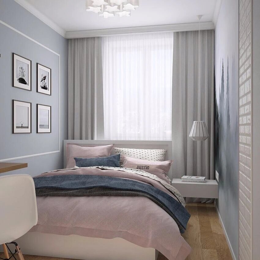 - Если в узкой спальне два окна расположены по длинной стене, то лучше оформить окно чуть на контрасте, это разобьет длину, появится ощущение правильной формы пространства.