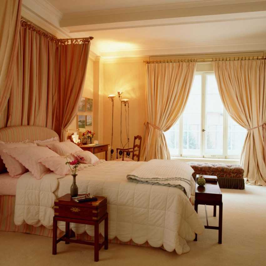 Длинные шторы, складками ниспадающие на пол, придают спальне элегантности. Чтобы добиться такого эффекта обычно занавески делают на 5-15 см длиннее, чем высота до уровня пола.