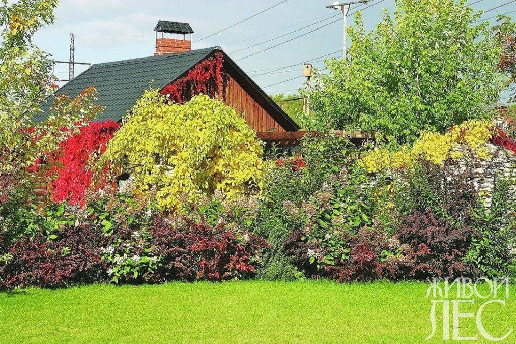 Почти все растения для зеленого ограждения недорогие, но есть еще несколько видов: шиповник, плетистая роза, облепиха, девичий виноград. Последний – самый дешевый и доступный. Покупать девичий виноград необязательно, можете отрезать несколько веточек для черенкования и размножать растение сами. Осенью цвет листьев винограда сорта Мурорум становится пурпурным или багряным, и это дополнительный плюс для дизайна дачи.