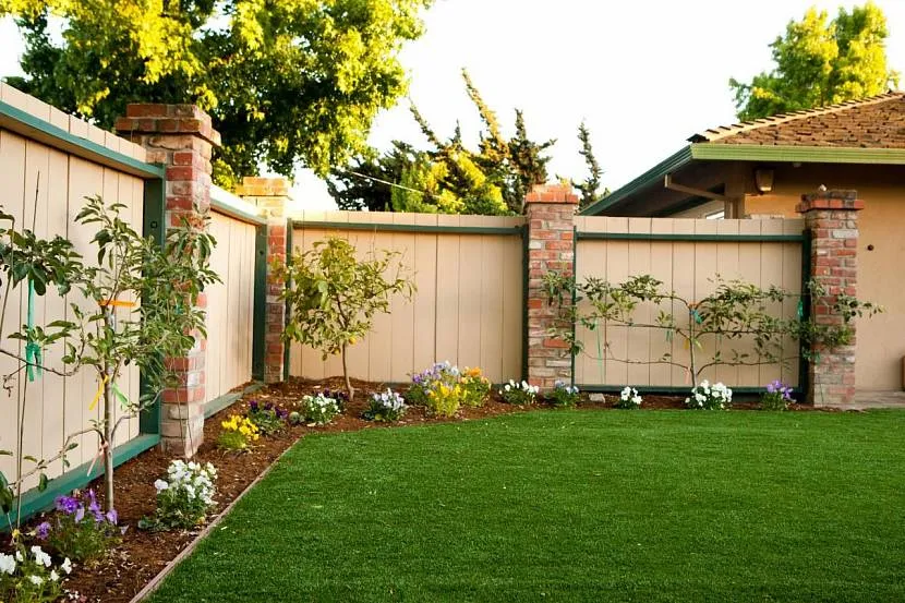Декоративные растения вдоль забора в сочетании с плодовыми деревьямиИсточник dizainexpert.ru