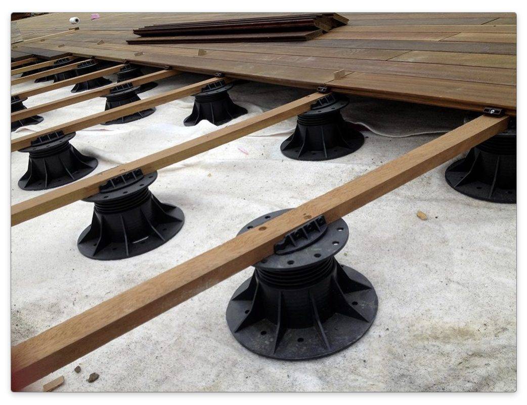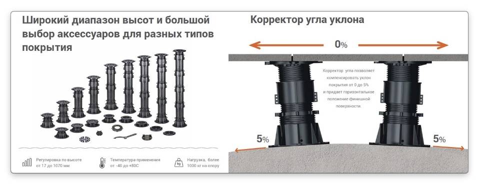 В качестве основного материала при изготовлении может использоваться металл или пластик, иногда они комбинируются. Одним из главных преимуществ опор регулируемого типа является способность выдерживать большой вес конструкции, достигающий 1000 кг. Предусматривается возможность плавной регулировки настила, причем не только по высоте, но и по углу наклона.