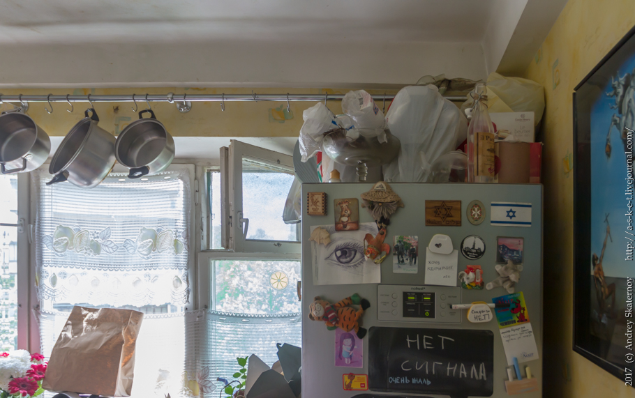 Кстати, на фото видно еще одно моё ноу-хау. Кастрюли занимают много места, а гардины и занавеси на маленькой кухне не нужны. Поэтому сооружаем такую конструкцию на четырех креплениях, снабжаем крючками, и вешаем кастрюли и сковородки:)