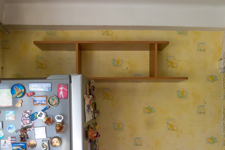 Полку будем вешать на стену справа над холодильником.