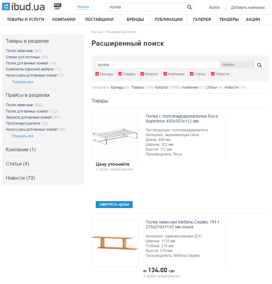 Как вы увидели по фото, нам не сильно до красоты, нам бы больше функционально.Поэтому планировалась одна длинная полка, фактически – покупается подходящего размера т.н. мебельный щит и к нему – крепления на стену.Так я последний раз до этого делал полку себе над компом. Длиной 80 см., она обошлась мне, за всё про всё, около 300 грн. в строительном супермаркете. Решил я, было, по привычке поехать в ближайший, но тут вспомнил, что недавно видел обзор интернет-супермаркета.Название, как старый айфоновод я не мог не запомнить – ibud.ua . Ок, посмотрим, что нам могут предложить.