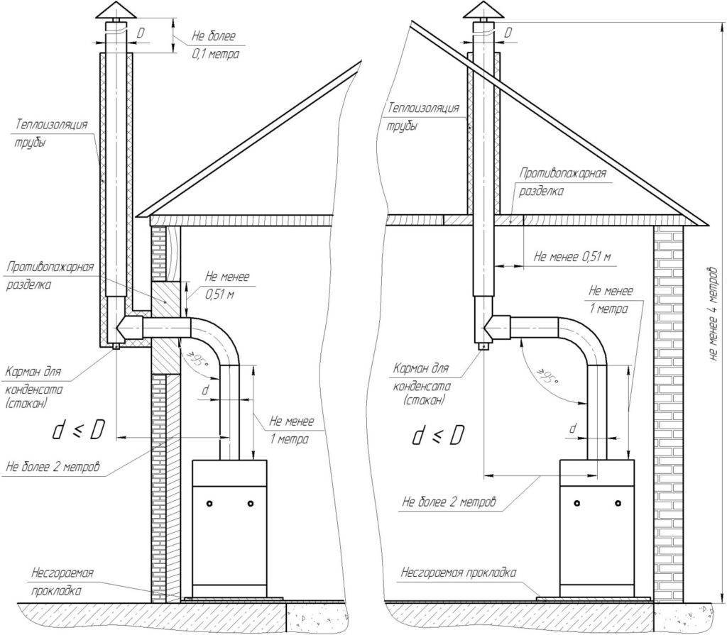 - Часть газоотвода, расположенная на улице, должна быть выше конька крыши.