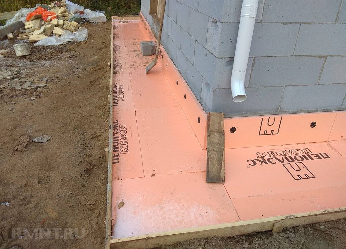 Крайне важно, чтобы теплозащита фундамента и отмостки имела непрерывный контур. Лучший вариант — когда сначала укладывается горизонтальный пояс, а затем на него нижним торцом опираются плиты цокольной теплоизоляции