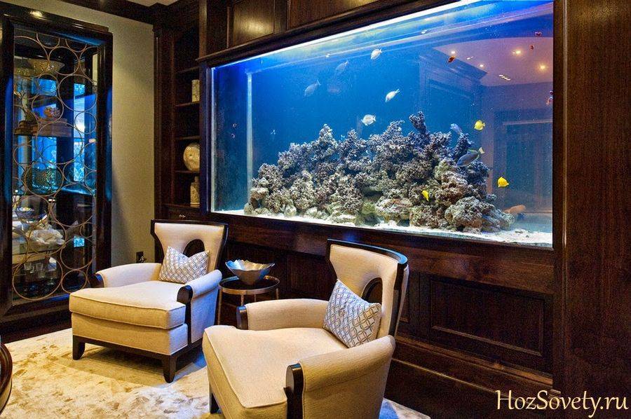 Аквариуму с рыбками, витрине с коллекцией в гостиной потребуется дополнительное индивидуальное освещение, которое помогут создать точечные или светодиодные светильники.