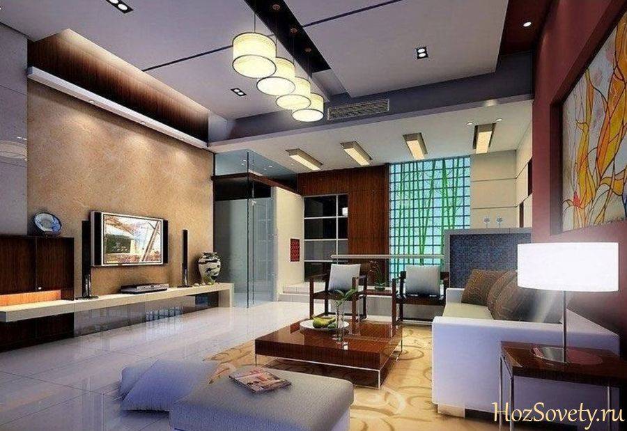 Чтобы обойтись без люстры, придется поставить много источников света. Точечные светильники в зале нужно устанавливать с учетом ряда рекомендаций: