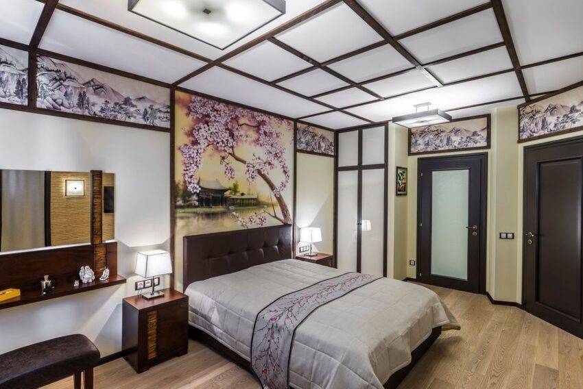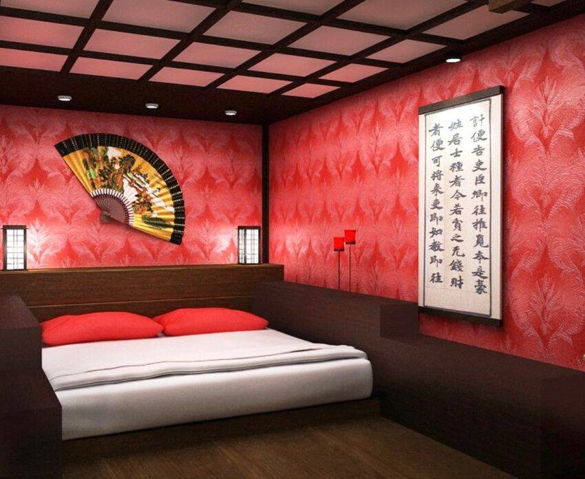 Японские спальни формируются как довольно аскетичные, а потому не допускается использование напольного пространства в качестве платформы для размещения светильников.