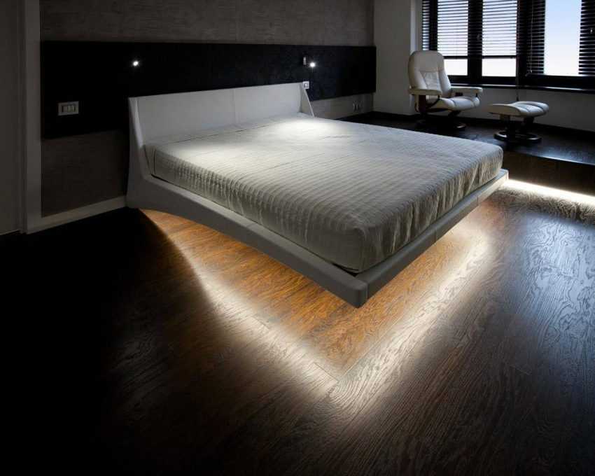 Одни из трендов последних лет – подсветка кровати в спальне. Особенно эффектно выглядит подсветка снизу. В этом случае создается эффект парения кровати, будто она висит в воздухе.