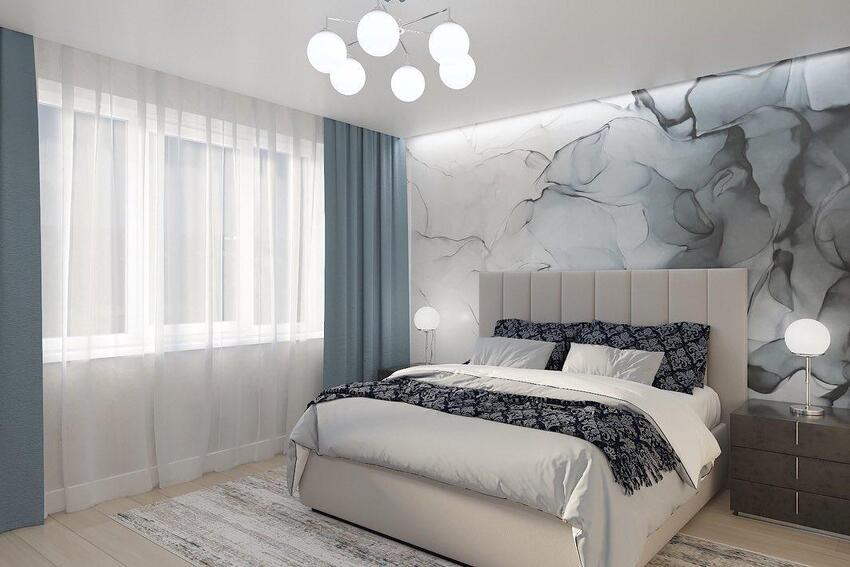 Стоит отдавать предпочтение светильникам с минималистичным дизайном. Допускается использование холодного и теплого света для разных областей спальни.