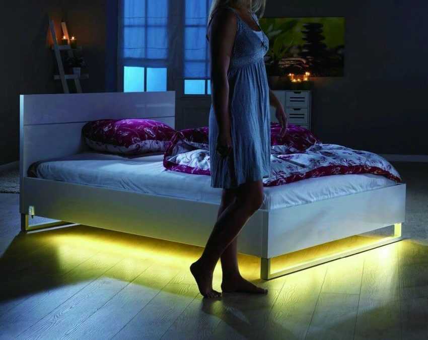 Сейчас можно заказать и купить кровать с самыми разными вариантами подсветки. Но вполне возможно создать подсветку в спальне своими руками. Например, эффект парящей кровати достигается совсем несложным способом. Очень просто монтируется подсветка в спальне светодиодной лентой – она крепится по периметру кровати в нижней ее части.