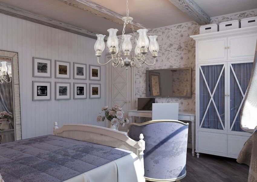 В спальню, оформленную в стиле прованс, требуется изящная и легкая люстра, сделанная из керамики или стекла.