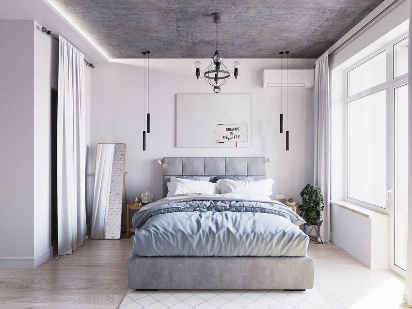 В этом случае спальня испытывает дефицит естественного света, который необходимо компенсировать за счет искусственного.