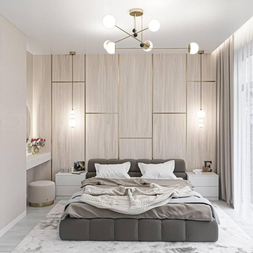 Привлекательно смотрятся решения, когда акцент в освещении спальни сделан на прикроватные светильники, торшер и точечную подсветку стен.