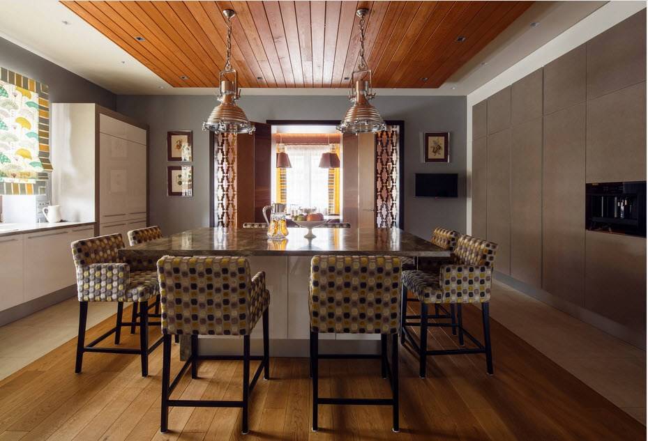 - Древесина. Экологичный, сохраняющий тепло и потому распространенный способ отделки, незаменимый для некоторых интерьерных стилей. Бюджетным вариантом служит обычная и шпунтованная доска, более изысканным и дорогостоящим — паркетная.