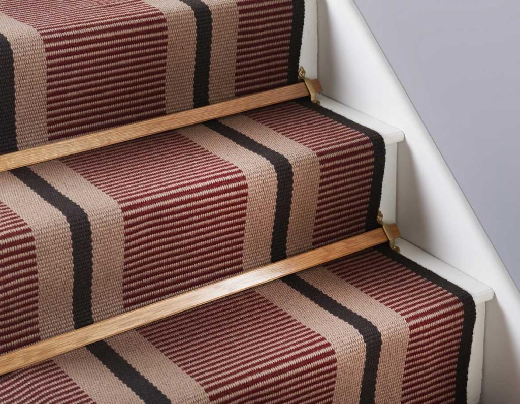 При использовании стержней напольное покрытие не следует расстилать на всю ширину ступеней для начала. Также следует предварительно надеть на стержни специальные кольца. Ковер накрывают прямым полотном, закрепляя его на ступенях стержнями.