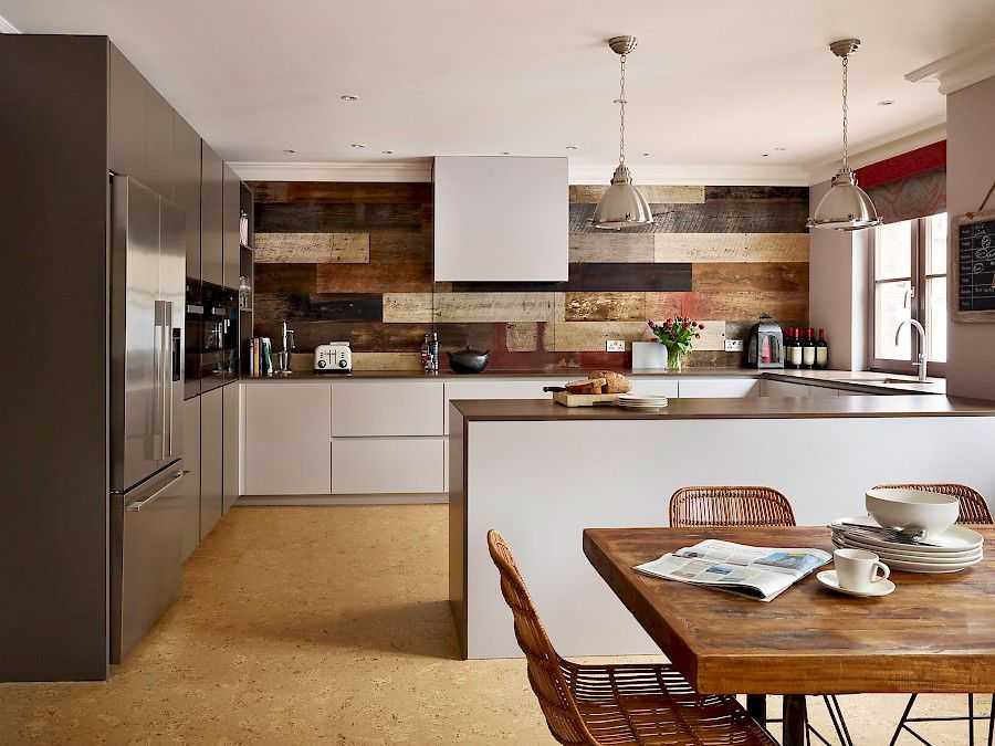 Отделка ламинатом стен кухни подходит для разных стилей, например, она идеальна для классики