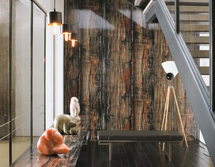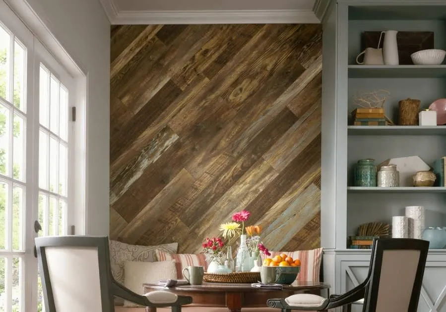 Еще один пример комплексной отделки большой стен. Сбалансированное сочетание цветов, позволяет создать целостный интерьер. А использование ламината разного размера делает поверхность неоднородной, придает ей объем.