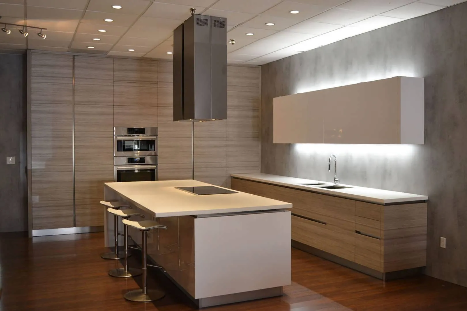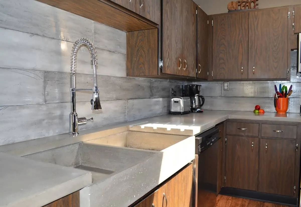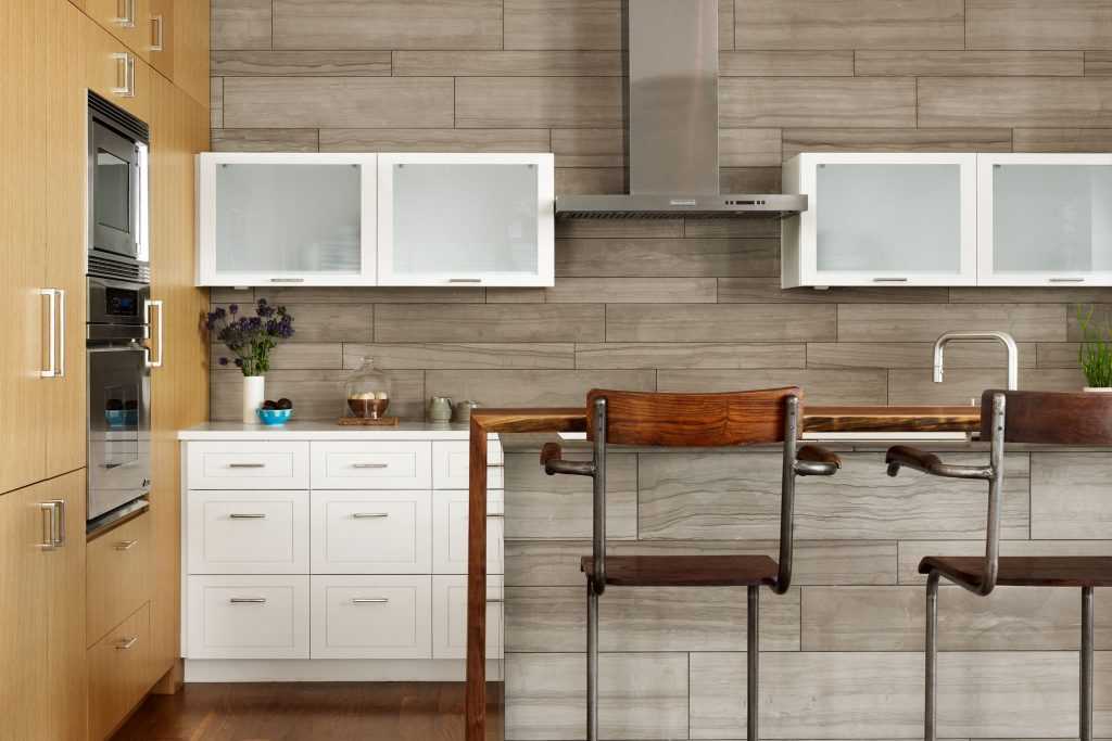 Стильная минималистичная кухня, акцент в которую вносят геометрически правильные ламинированные доски, расположенные в зоне фартука и смежной с ним стене.