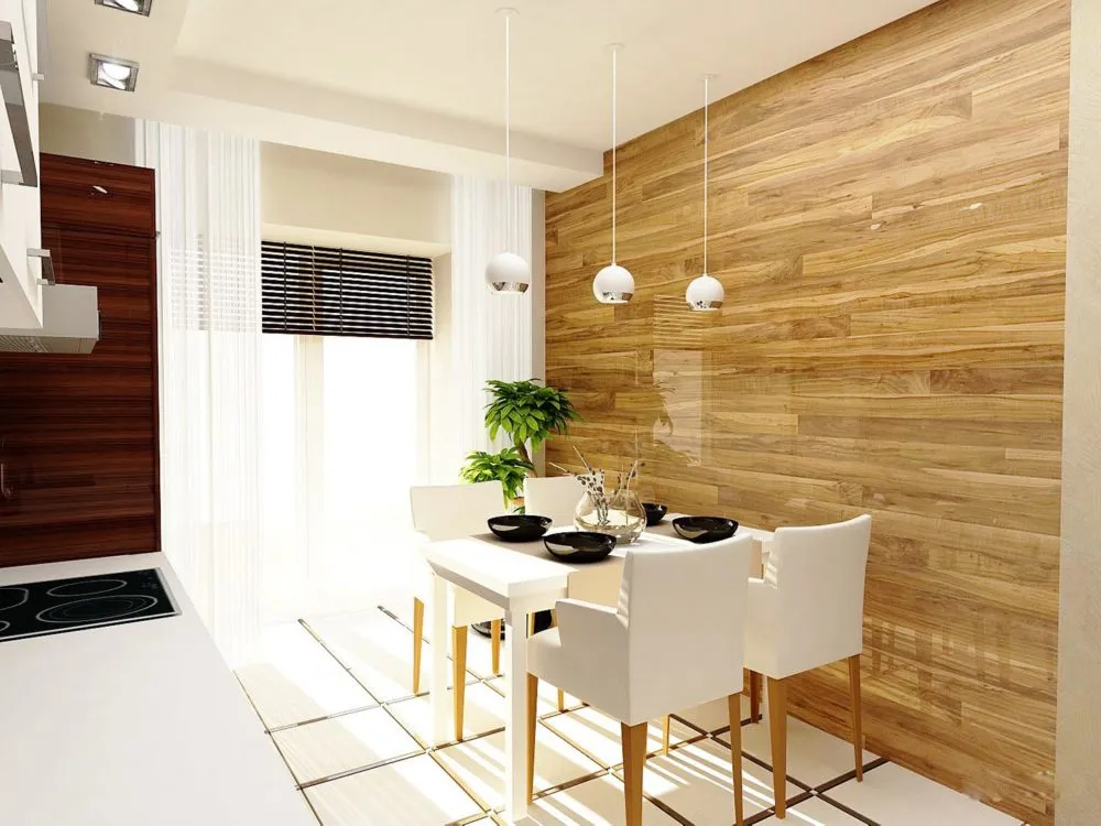 Ламинат на стене на кухне может применяться с разными целями. Самая очевидная – эстетическая. Но также плитки обеспечивают хорошую защиту от грязи, пыли и влаги. А ещё, это удачное дизайнерское решение, позволяющее легко зонировать помещение. Например, если кухня совмещена со столовой или гостиной, можно часть стены оклеить обоями или покрасить, а часть, относящуюся к кухне, покрыть ламинатом. Смотрится весьма изысканно и в то же время не броско.