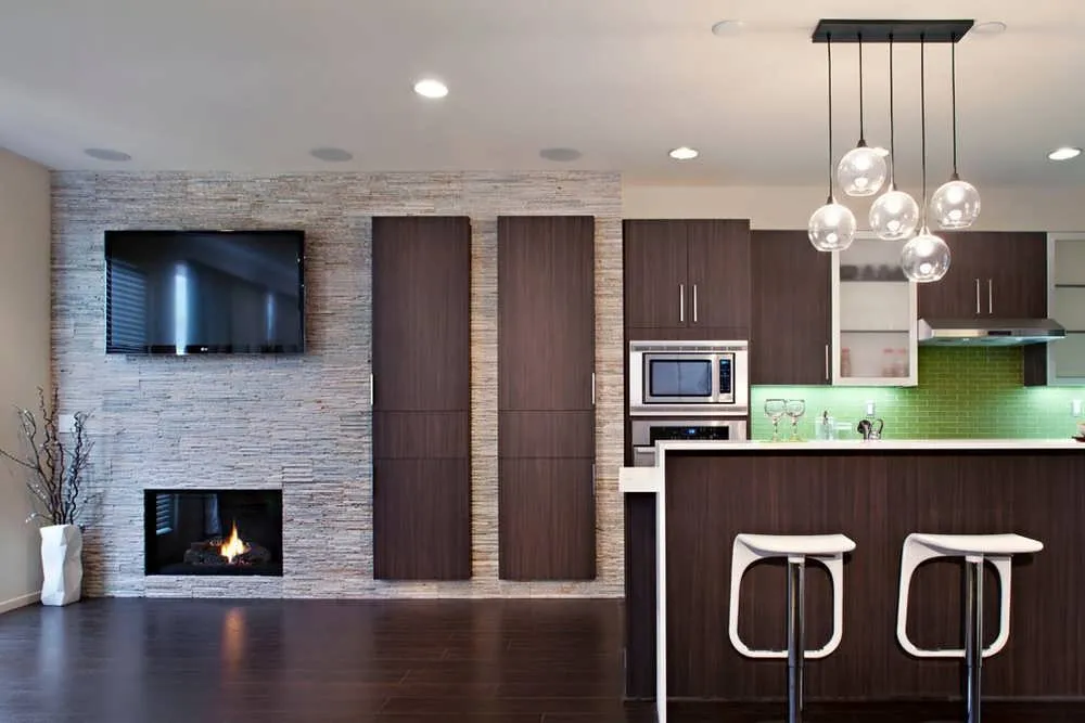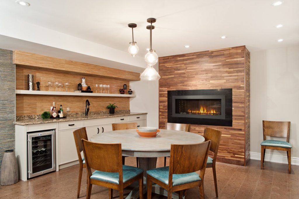 На фото современная кухня с камином и кухонным гарнитуром, ламинированной доской обшита целая стена и фартук. Оттенки деревянного декора отлично сочетаются с полом и стульями из натурального дерева.