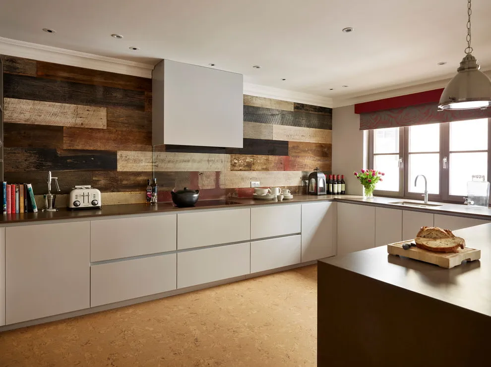 Ламинат подойдет для фартука и комплексной отделки всей стены. На нем не видны загрязнения возникающие в процессе работы.