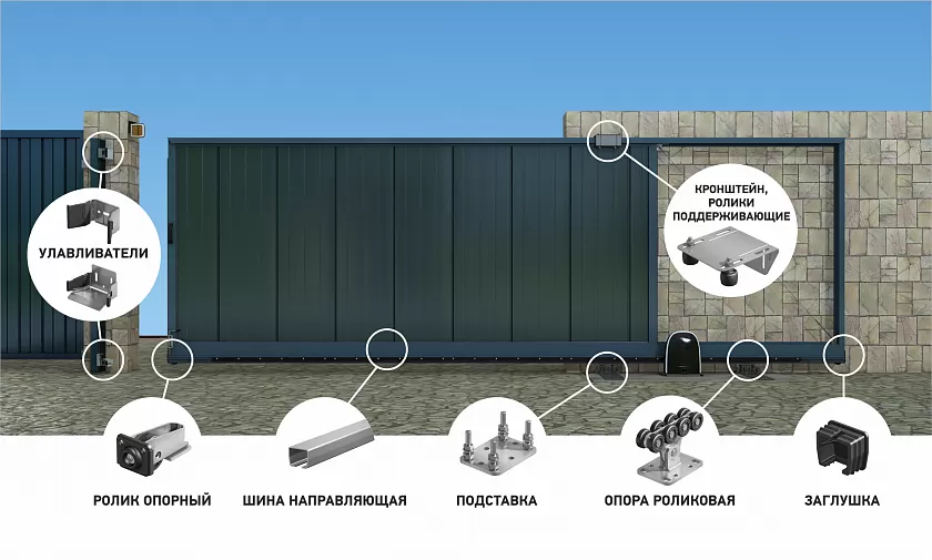 Даже если делают консольные откатные ворота своими руками, комплект, состоящий из направляющей балки, роликов, концевых роликов и уловителей покупают обычно в фирме. Все запчасти рассчитываются исходя из размеров полотна, материала каркаса и типа обшивки: вес имеет существенное значение. Потому желательно со всеми этими параметрами определиться заранее.