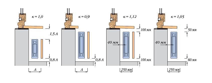 Точные рекомендации указаны в паспортах приборов. Примерные потери по теплоотдаче при различных вариантах размещения показаны на рисунке ниже.