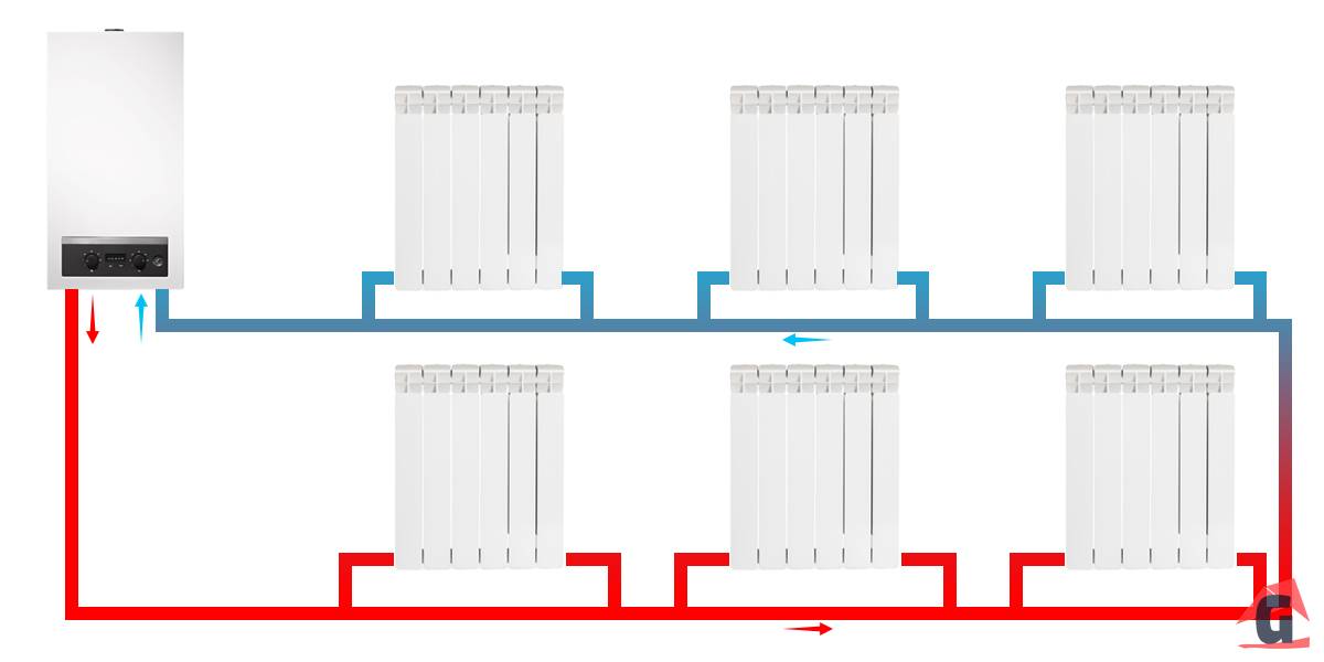Схема типичной двухтрубной системы отопления в частном доме.