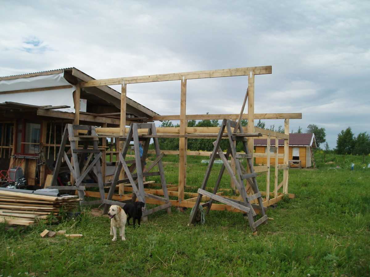 После этого приступают к постройке крыши. Для этого нужно разместить на стены сверху поперечные балки, установить на стропилах обрешётку, уложить на неё материал, из которого делается кровля — шифер, черепица или другой материал.
