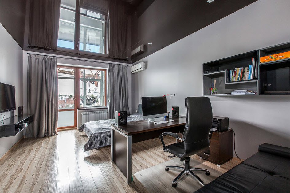 Легкие подвесные конструкции спрячут светильники и провода, а глянцевые светлые фактуры – компенсируют трату высоты и нехватку света. Здесь снова уместны и практичны зеркальные потолки, которые зрительно увеличивают глубину комнаты вдвое.