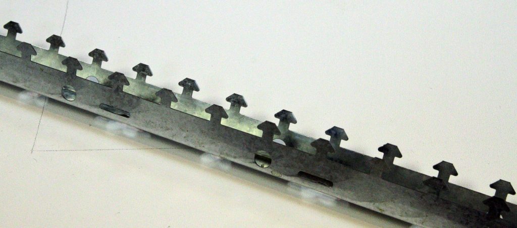 - При монтаже реечного потолка используются специальные крепёжные элементы – стрингеры. Представляют собой зубчатые профили, одновременно выполняющие роль направляющих и кронштейнов для фиксации алюминиевых облицовочных элементов. Рейки собираются по принципу шип-паз, а особый изгиб профиля элемента позволяет уложить каждую из них в специальные зубцы на стрингере.
