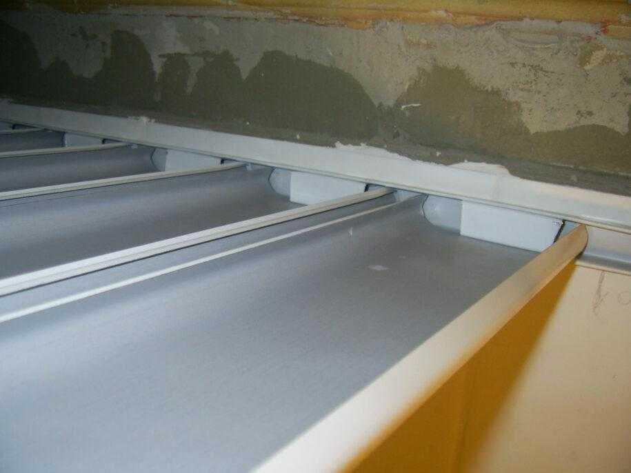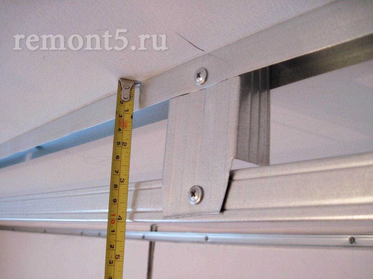 - Проводят установку основных направляющих. Для этого берут профили из алюминия и фиксируют их при помощи саморезов в точках, отмеченных ранее карандашом на стенах. На черновом потолке профили крепят при помощи подвесов.