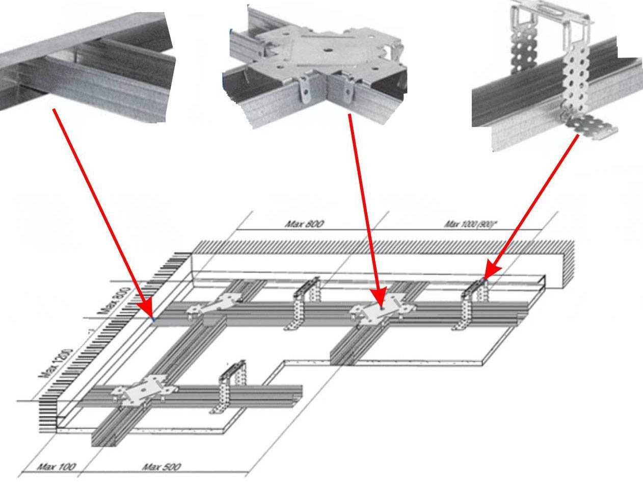 Количество всех вышеперечисленных элементов подсчитывается исходя из того, сколько в конечном итоге профилей придется задействовать для организации каркаса в помещении.