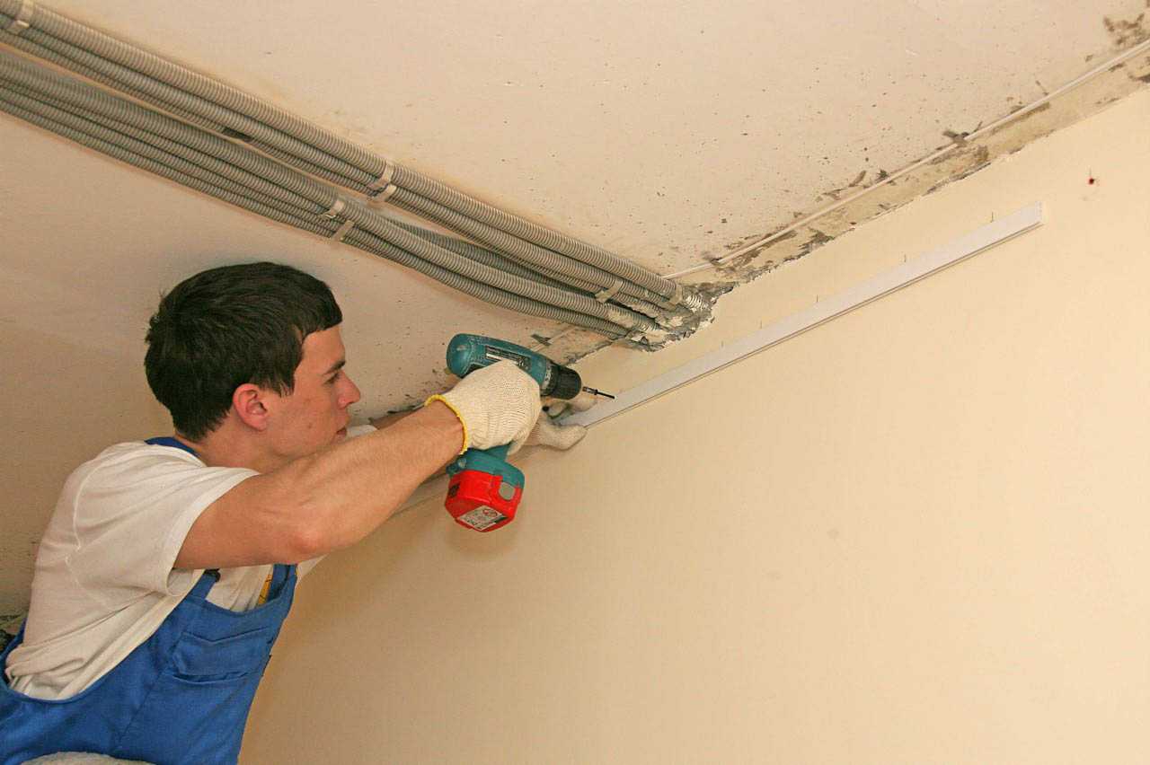 потолочный плинтус, красиво оформляющий границу между потолком и стенами, монтируется в последнюю очередь.