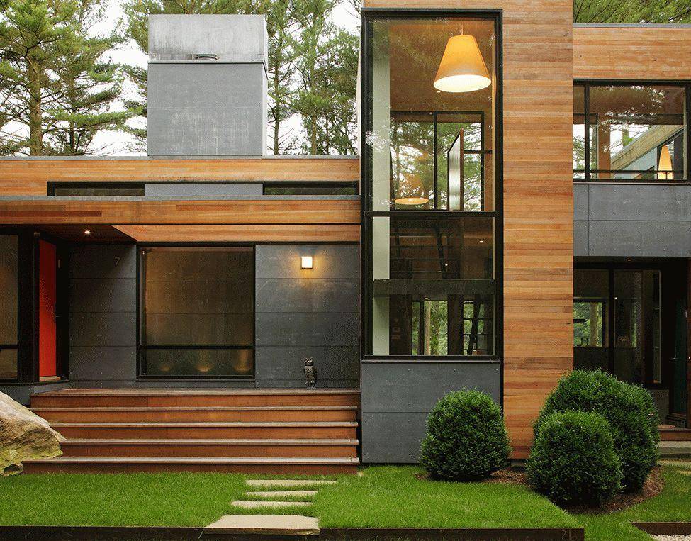 Чтобы улучшить фасад дома, лучше комбинировать его с деревянными или бетонными элементами. Плюсами являются прочность и долговечность как самого материала, так и ковки, и сварных швов. Металл – материал дорогой и требует расходов на окрашивание и средства от коррозии.