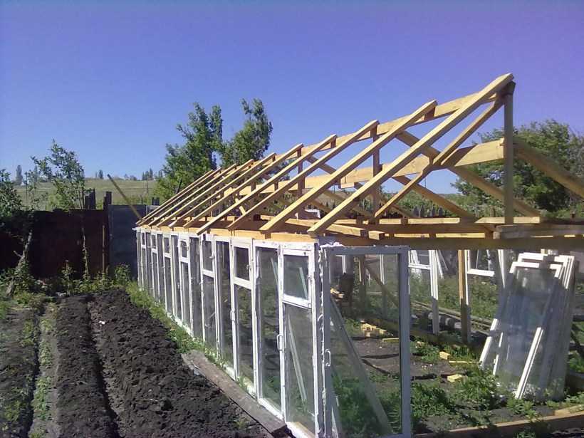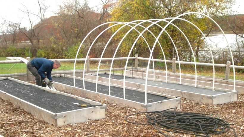 После того как основание готово, устанавливается рама. При использовании деревянных брусьев или металлических труб, они должны быть закреплены в углах и в середине будущего парника. После установки рамы можно начать накрывать парник выбранным материалом.