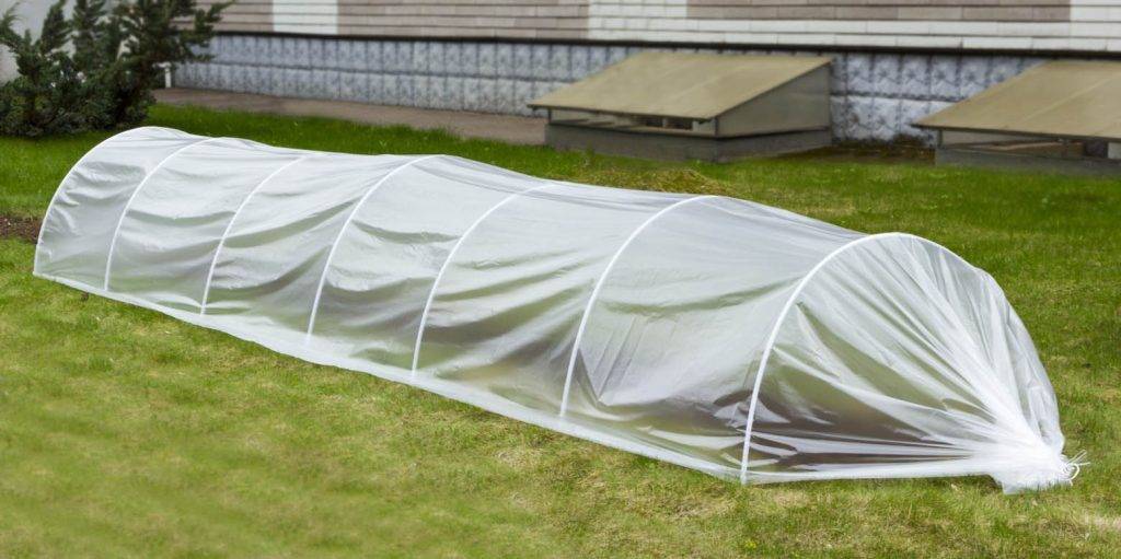 Собранный каркас накрывается обычно лёгкими неткаными материалами — чаще всего полиэтиленовой плёнкой. Иногда используется стекло. Чтобы не было потерь тепла, добейтесь плотного прилегания укрывного материала к грунту со всех сторон. В дальнейшем следите за микроклиматом внутри парника, при необходимости проветривая его и притеняя.