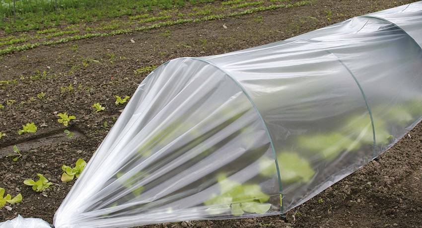 Собранный каркас накрывается обычно лёгкими неткаными материалами — чаще всего полиэтиленовой плёнкой. Иногда используется стекло. Чтобы не было потерь тепла, добейтесь плотного прилегания укрывного материала к грунту со всех сторон. В дальнейшем следите за микроклиматом внутри парника, при необходимости проветривая его и притеняя.