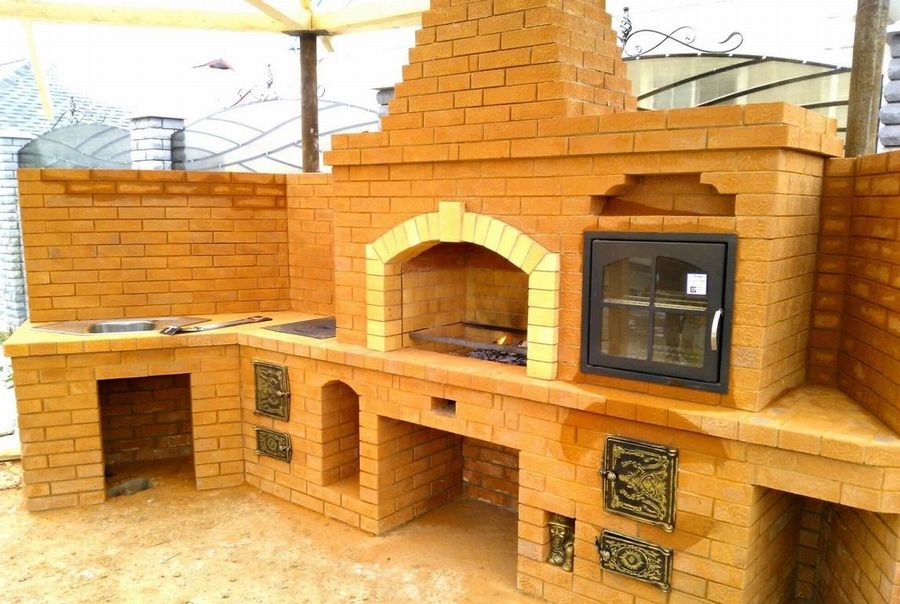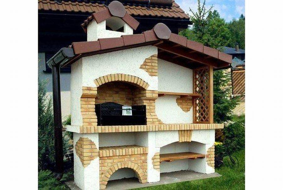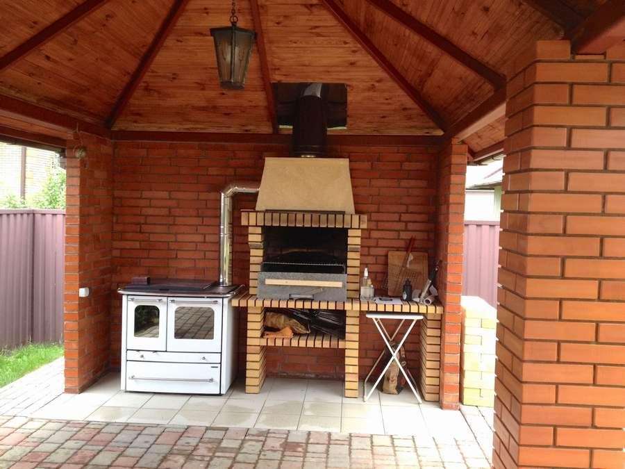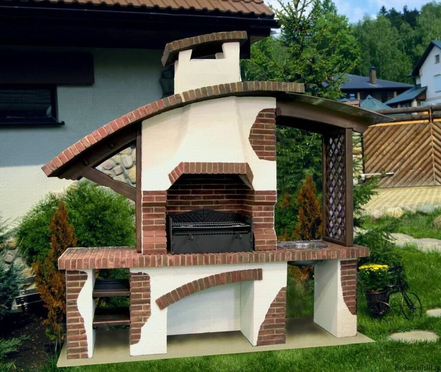 Данная модель подойдет даже для размещения в открытой беседке. В таком случае беседку лучше также выполнить из кирпича. И конечно же необходимо позаботиться о наличии разъема под дымоход.