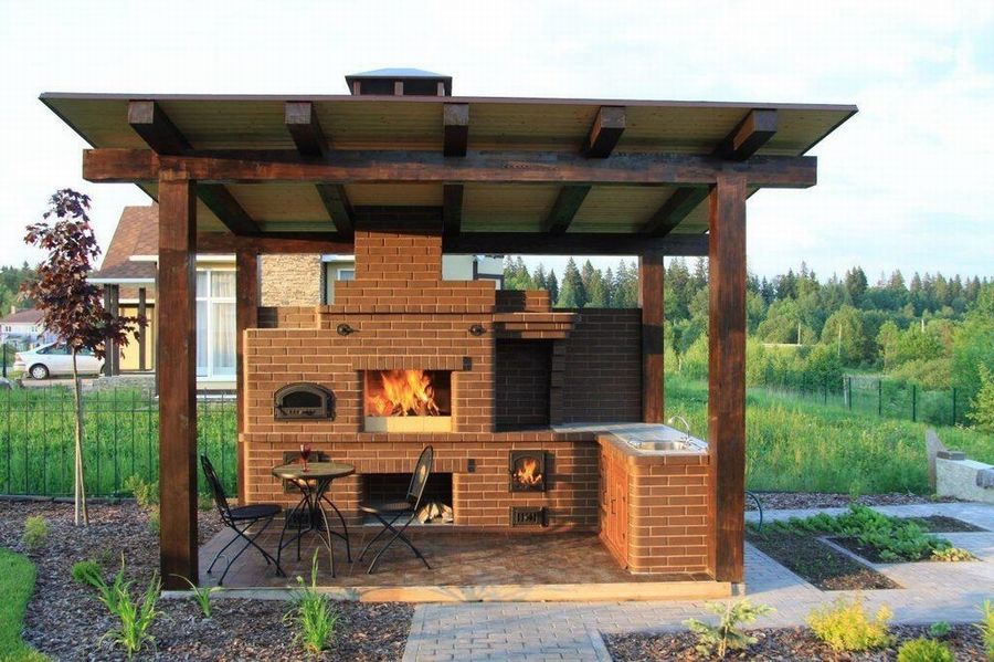 Можно соорудить и более сложную печь, с кухонной плитой или камином, рабочими столами, мойкой и столешницей из натурального камня. Проявите фантазию, и ваша беседка станет желанным местом отдыха ваших гостей!