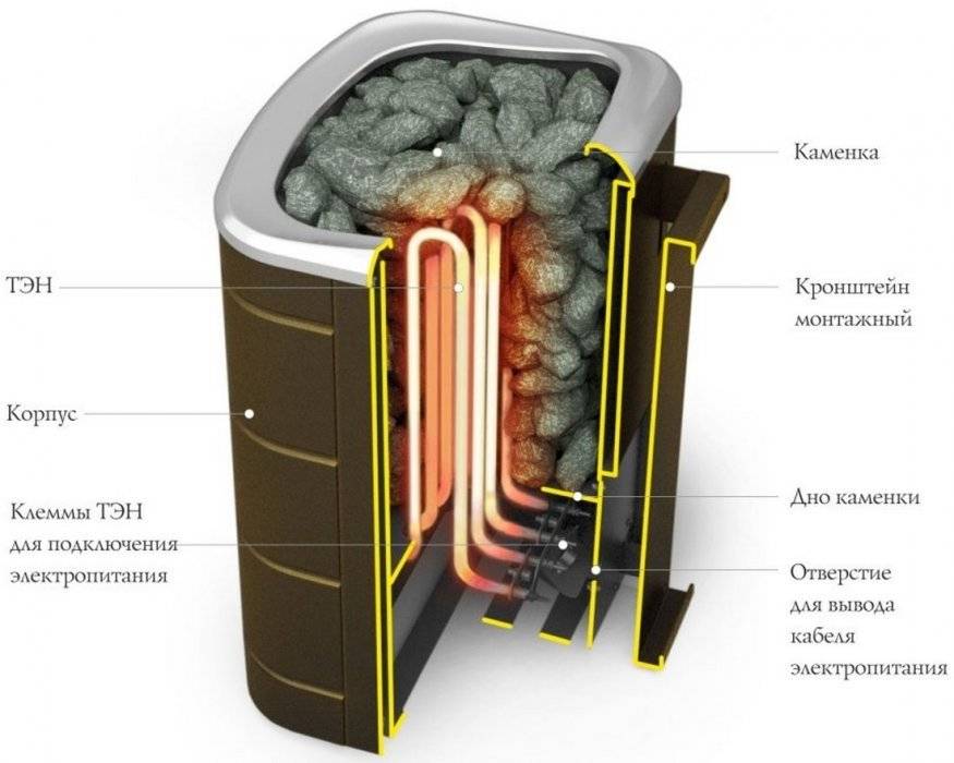 Электрическая печь — это нагревательный электроприбор, у которого для выработки тепловой энергии используются специальные элементы — ТЭНы. Это аббревиатура, обозначающая ТермоЭлектрический Нагреватель, или Трубчатый Электрический нагреватель. Он является сердцем печи, при подключении к сети электропитания ТЭН нагревается и отдает тепло в помещение и смежные узлы печи (каменка, бак для воды).
