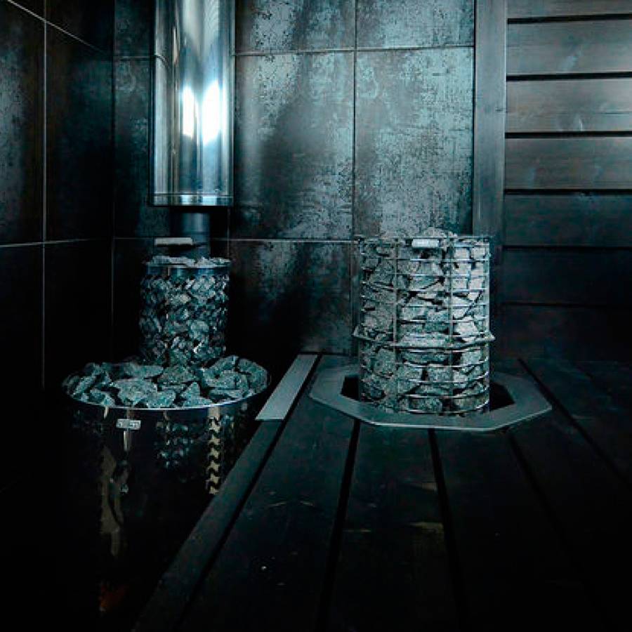 Круглая конструкция корпуса отлично смотрится в центре помещения парной или может быть встроена в нижний полок. Особенностью приборов линейки является возможность подачи воды (можно и с добавлением ароматизаторов), как на верхнюю часть корпуса, так и на все внешние поверхности камней под любым углом.