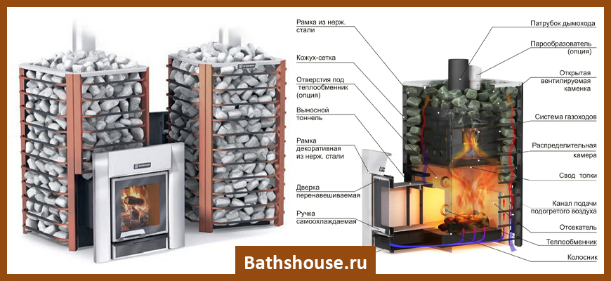 Камни укладываются в отсек в форме ванной. Это позволяет набрать достаточно много тепловой энергии. Однако получить действительно живой пар сложно, поскольку верхний слой булыжников нагревается не выше 200 градусов. В результате для получения настоящей атмосферы русской бани придется долго выводить печь на оптимальный режим.