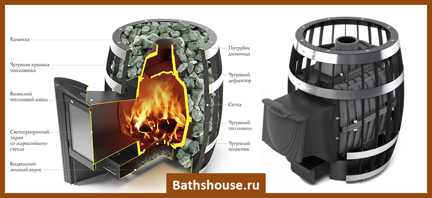 Отличается своей долговечностью. Топка сделана из литого чугуна с примесью графита. Каменка сделана из углеродистой стали. Может создавать режим сухой парной. Если каменку закрыть, то получается мягкий и влажный пар. Также отопительную систему возможно усовершенствовать, добавив образователь пара, выносной бак, конвектор.